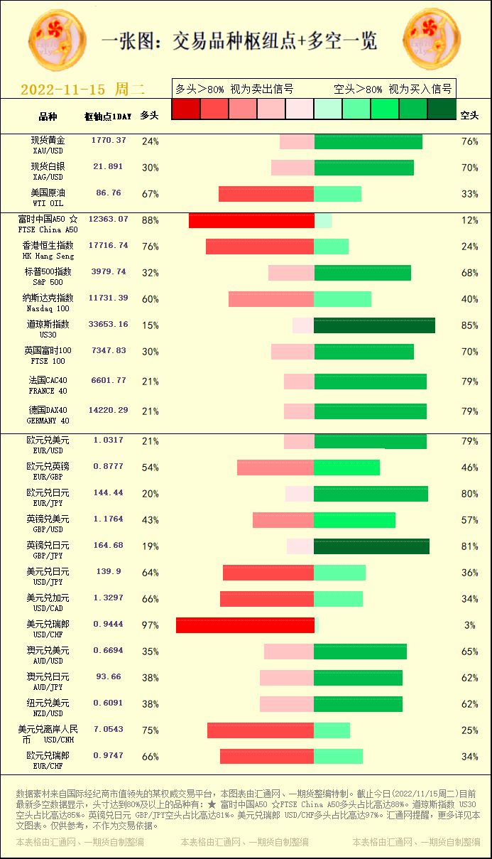 一张图:交易品种枢纽点+多空占比一览。截止今日(2022/11/15周二)目前最新多空数据显示,头寸达到80%及以上的品种有:★ 富时中国A50 ☆FTSE China A50多头占比高达88%。道琼...