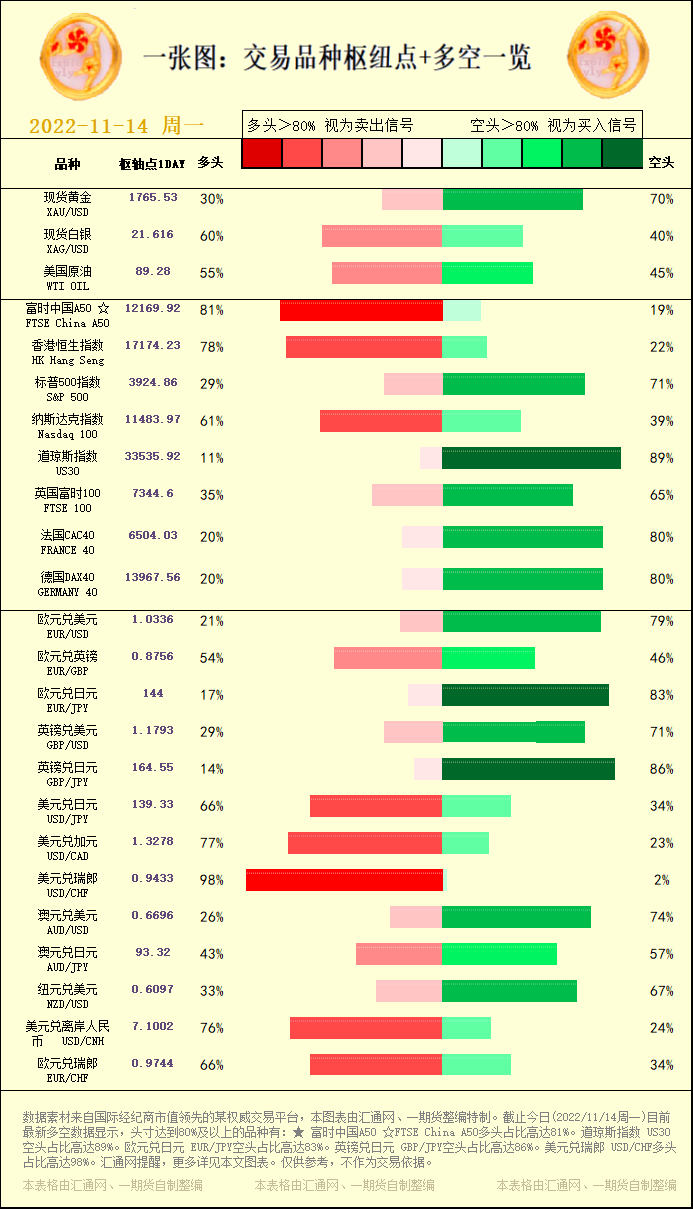 一张图:交易品种枢纽点+多空占比一览。截止今日(2022/11/14周一)目前最新多空数据显示,头寸达到80%及以上的品种有:★ 富时中国A50 ☆FTSE China A50多头占比高达81%。道琼...