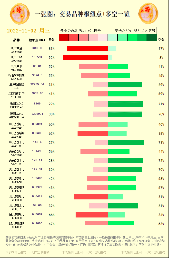 一张图:交易品种枢纽点+多空占比一览(2022/11/02周三)。截止今日(2022/11/02周三)目前最新多空数据显示,头寸达到80%及以上的品种有:★ 现货黄金 XAU/USD多头占比高达83%...