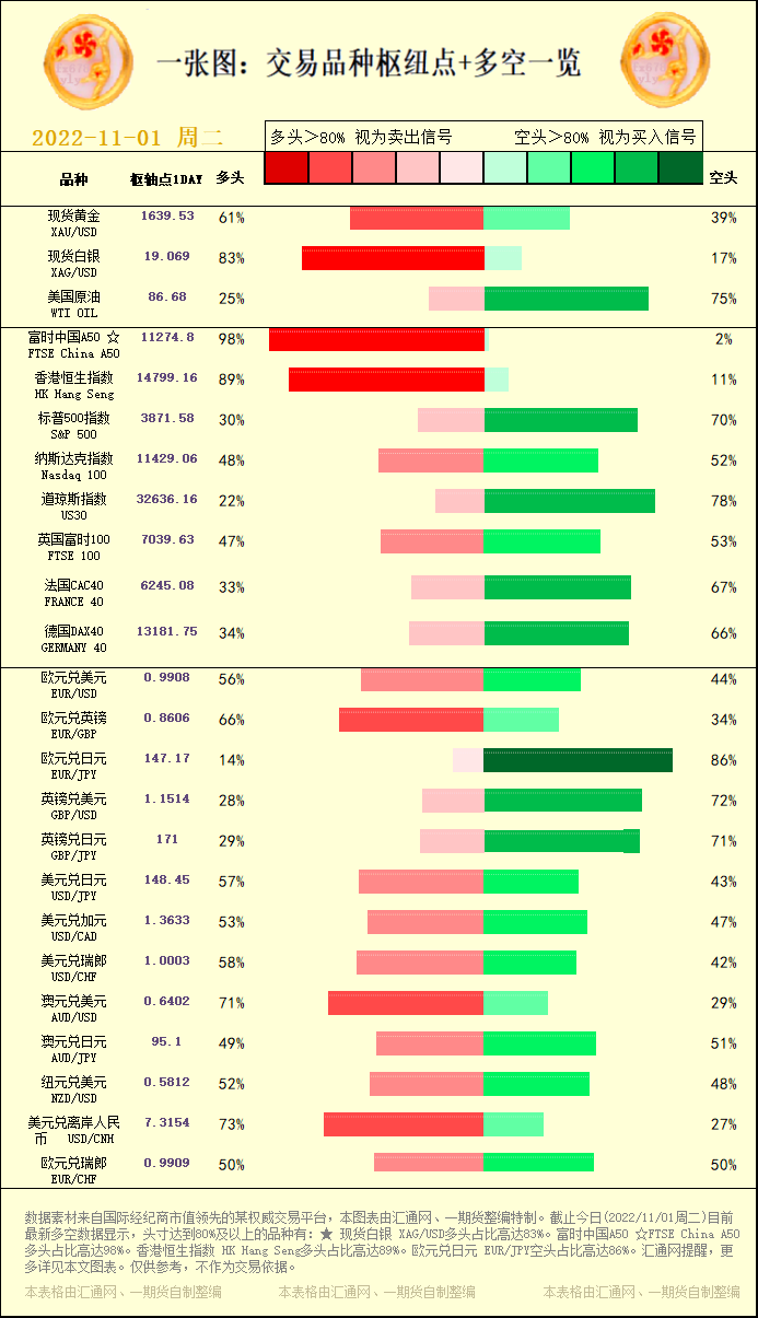 一张图:交易品种枢纽点+多空占比一览(2022/11/01周二)。截止今日(2022/11/01周二)目前最新多空数据显示,头寸达到80%及以上的品种有:★ 现货白银 XAG/USD多头占比高达83%...