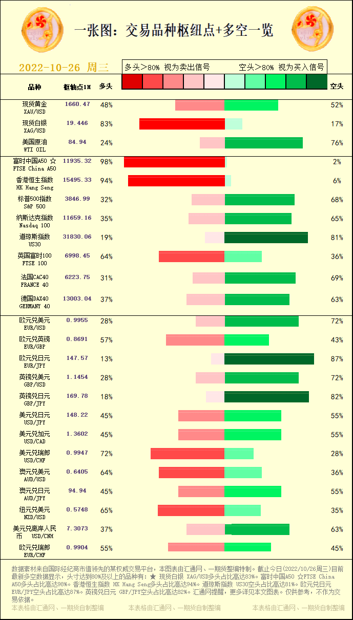 一张图:交易品种枢纽点+多空占比一览(2022/10/26周三)。截止今日(2022/10/26周三)目前最新多空数据显示,头寸达到80%及以上的品种有:★ 现货白银 XAG/USD多头占比高达83%...