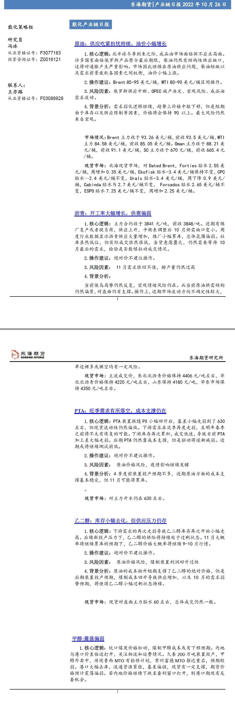 原油:供应吃紧担忧持续,油价小幅增长沥青:开工率大幅增长,供需偏弱PTA:旺季需求有所落空,成本支撑仍在乙二醇:库存小幅去化,但供应压力仍存甲醇:震荡偏弱L:下跌空间有限PP: 下跌空间有限免责声明:...