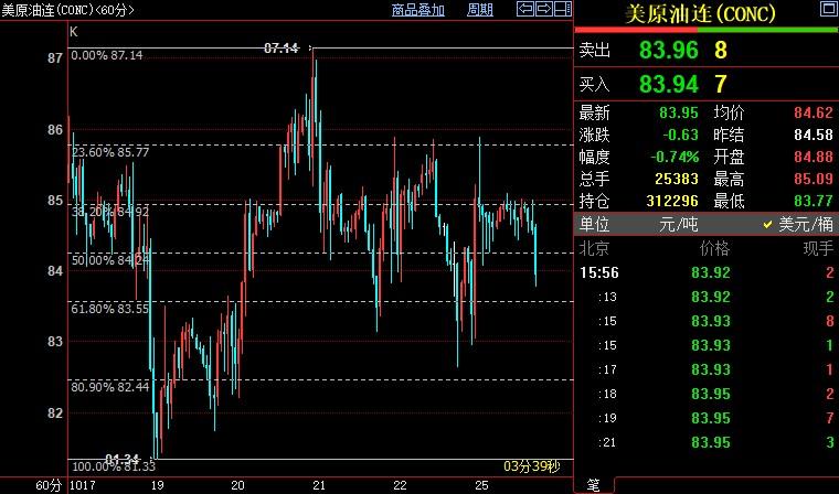 周二(10月25日),国际油价走弱,因美元指数回补日内跌势,且全球主要石油进口国需求疲软,人们对全球燃料需求增长放缓的担忧给油市带来压力。NYMEX原油仍下看82.44美元。北京时间15:57,NYM...