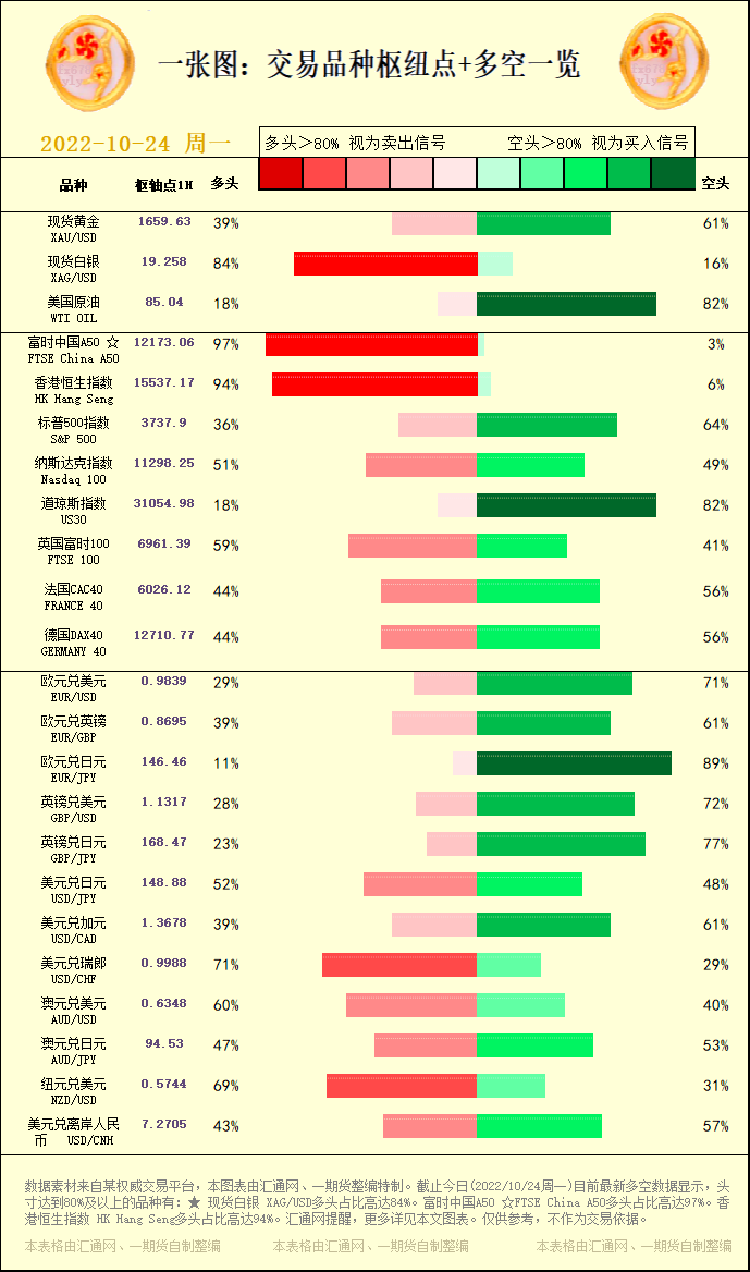 截止今日(2022/10/24周一)目前最新多空数据显示,头寸达到80%及以上的品种有:★ 现货白银 XAG/USD多头占比高达84%。富时中国A50 ☆FTSE China A50多头占比高达97%...
