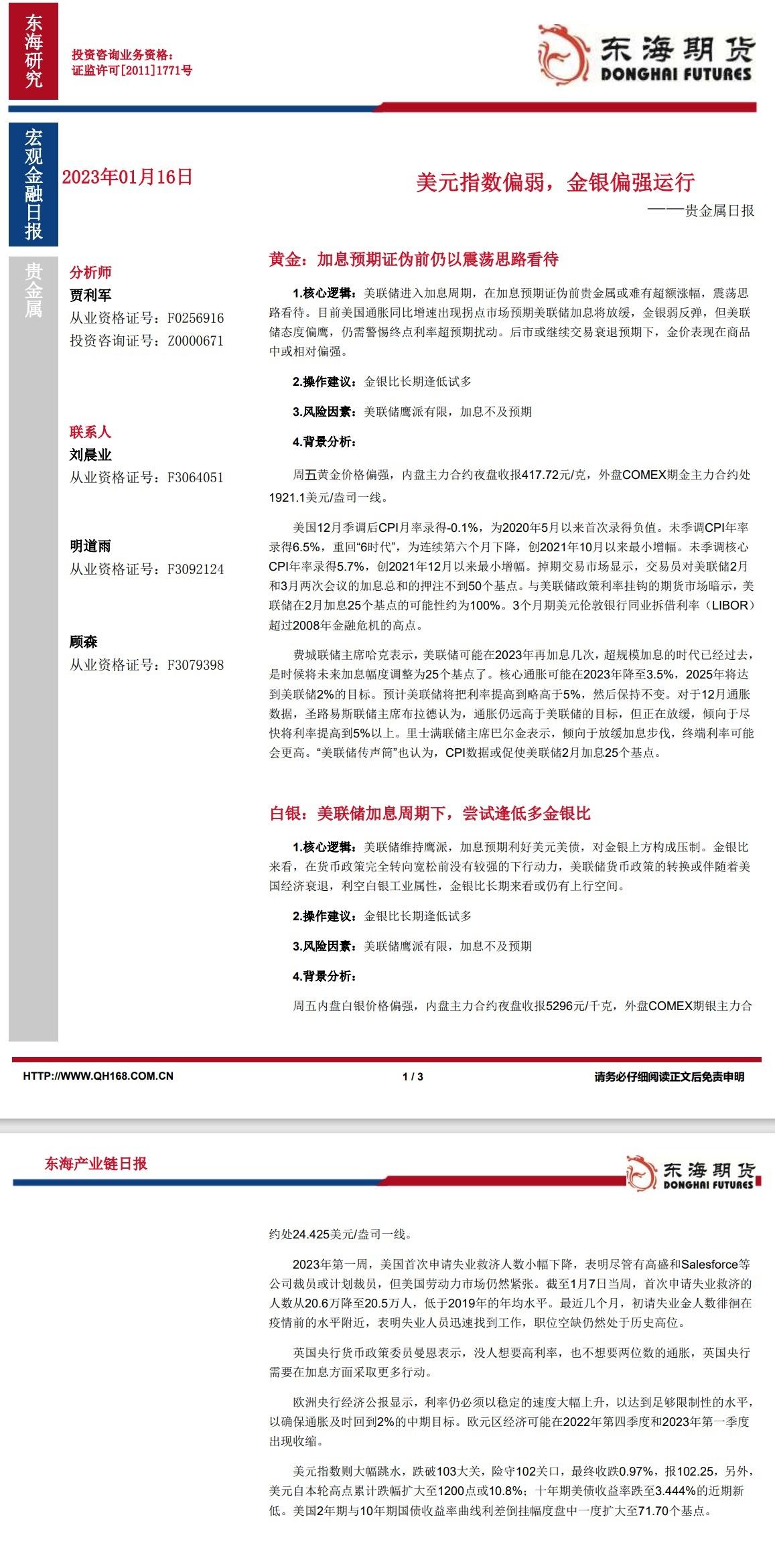 汇通财经APP讯——黄金:加息预期证伪前仍以震荡思路看待。白银:美联储加息周期下,尝试逢低多金银比。东海期货公司授权文本由“专注期货开户交易及专业行情分析资讯网站”:【一期货 www.1qh.cn】转...
