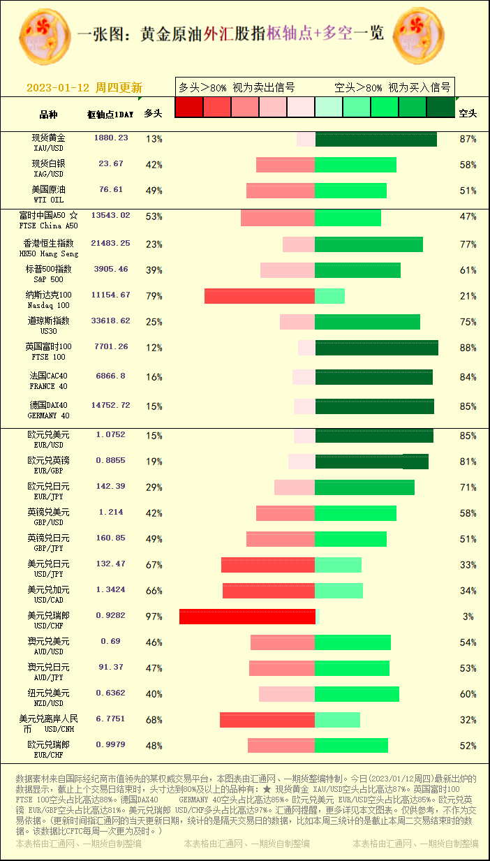 汇通财经APP讯——一张图:黄金原油外汇股指"枢纽点+多空占比"一览。今日(2023/01/12周四)最新出炉的数据显示,截止上个交易日结束时,头寸达到80%及以上的品种有:★ 现货黄金 XAU/US...