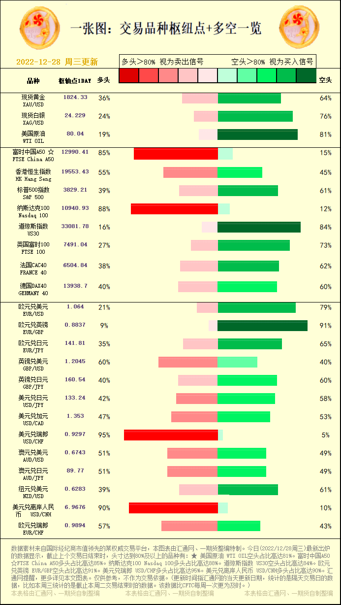 汇通财经APP讯——一张图:交易品种枢纽点+多空占比一览。今日(2022/12/28周三)最新出炉的数据显示,截止上个交易日结束时,头寸达到80%及以上的品种有:★ 美国原油 WTI OIL空头占比高...