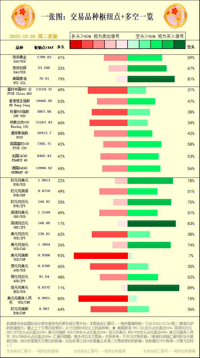 汇通财经APP讯——一张图:交易品种枢纽点+多空占比一览。今日(2022/12/20周二)最新出炉的数据显示,截止上个交易日结束时,头寸达到80%及以上的品种有:★ 美国原油 WTI OIL空头占比高...