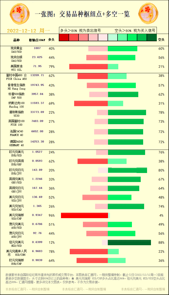 汇通财经APP讯——一张图:交易品种枢纽点+多空占比一览(2022/12/12周一)。截止今日(2022/12/12周一)目前最新多空数据显示,头寸达到80%及以上的品种有:★ 美元兑瑞郎 USD/C...