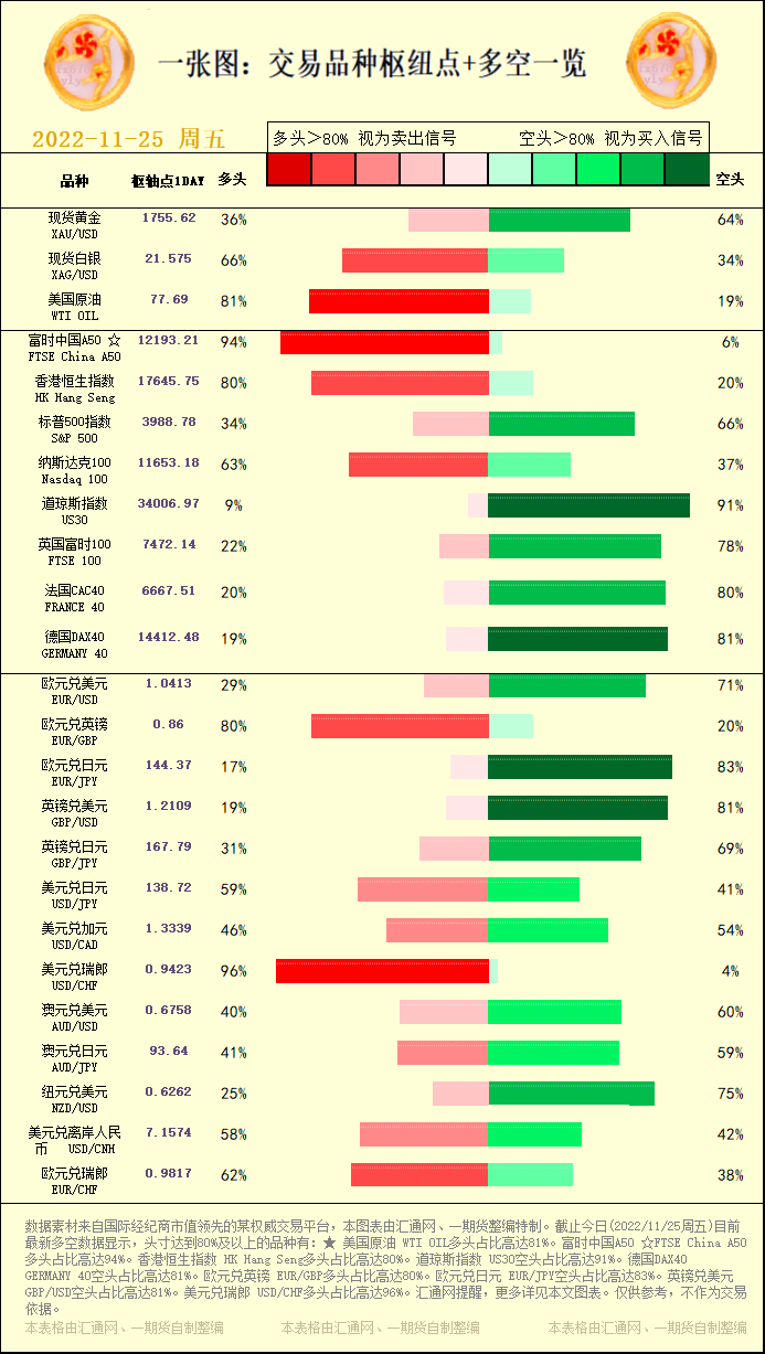 一张图:交易品种枢纽点+多空占比一览。截止今日(2022/11/25周五)目前最新多空数据显示,头寸达到80%及以上的品种有:★ 美国原油 WTI OIL多头占比高达81%。富时中国A50 ☆FTSE...