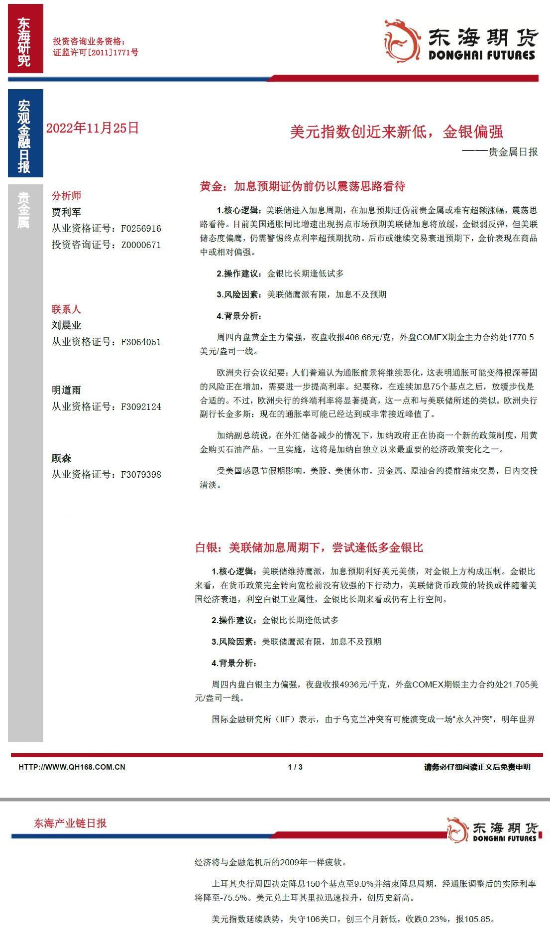 中信建投期货:美国宏观数据偏差,贵金属持续反弹【偏多头】隔夜贵金属小幅反弹,美联储纪要显示多位官员支持加息进程放缓,美元指数下破106,并且从隔夜公布的美国PMI数据来看,制造业PMI继续回落,为30...