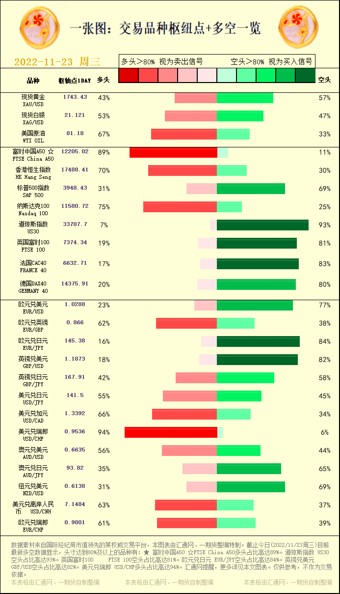 一张图:交易品种枢纽点+多空占比一览。截止今日(2022/11/23周三)目前最新多空数据显示,头寸达到80%及以上的品种有:★ 富时中国A50 ☆FTSE China A50多头占比高达89%。道琼...