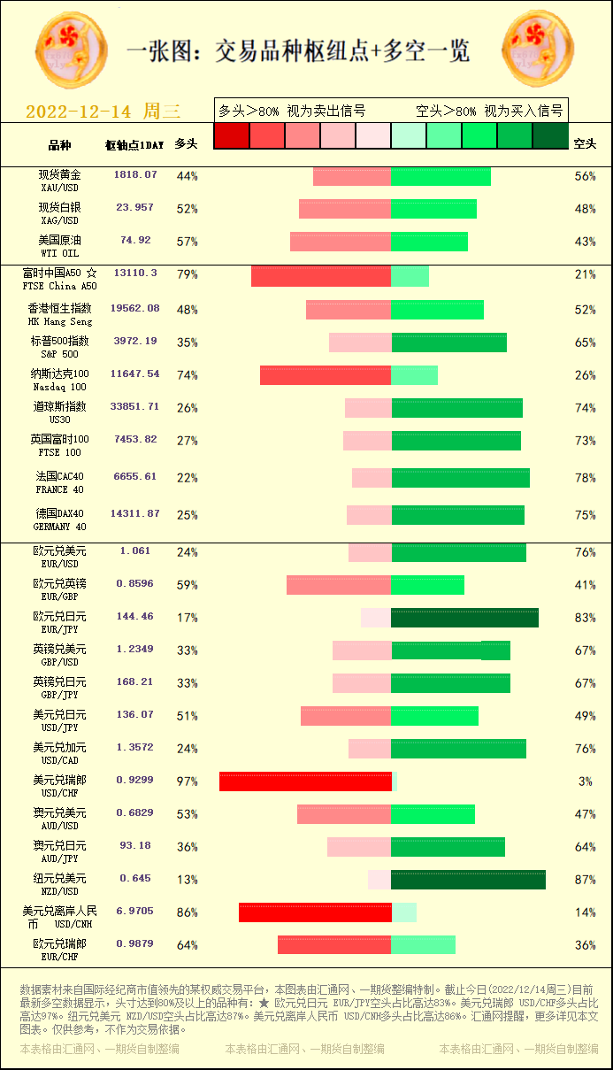 汇通财经APP讯——一张图:交易品种枢纽点+多空占比一览。截止今日(2022/12/14周三)目前最新多空数据显示,头寸达到80%及以上的品种有:★ 欧元兑日元 EUR/JPY空头占比高达83%。美元兑瑞郎 USD/CHF多头占比高达97%。纽元兑美元 NZD/USD空头占比高达87%。美元兑离岸人民币 USD/CNH多头占比高达86%。汇通网提醒,更多详见本文图表。仅供参考,不作为交易依据。
