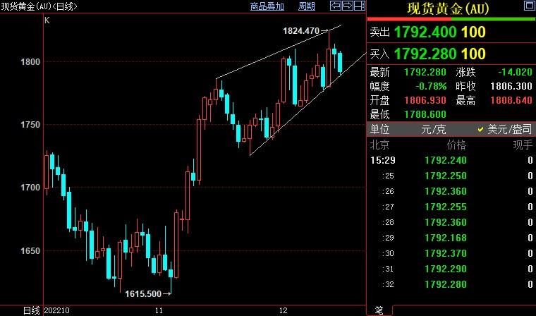 汇通财经APP讯——周四(12月15日),国际金价下跌近1%,进一步远离本周创下的6月底以来新高1824.39美元/盎司,因美联储主席鲍威尔隔夜表示明年将进一步加息。金价后市下看1775美元。