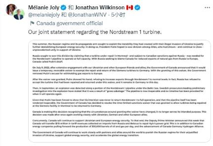 加拿大政府周三宣布,已撤销了对北溪1号管道涡轮机免受加拿大对俄罗斯石油和天然气行业制裁的豁免。加拿大外交部长梅拉妮·若利和自然资源部长乔纳森·威尔金森在周三的联合声明中宣布了这一决定。