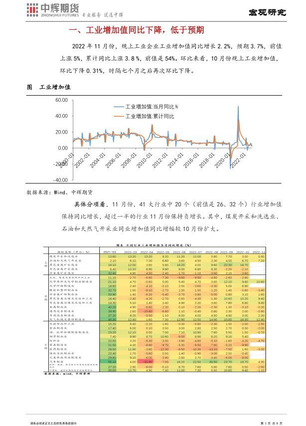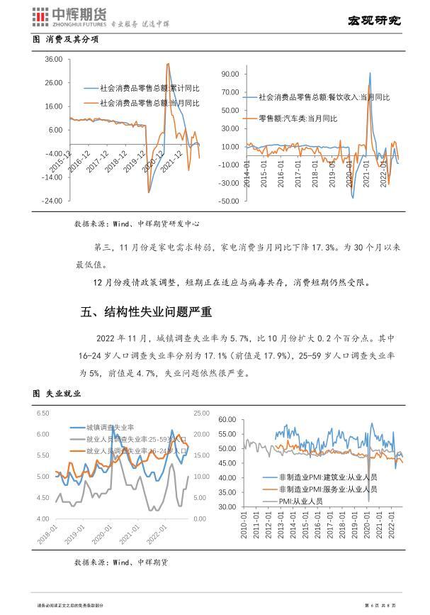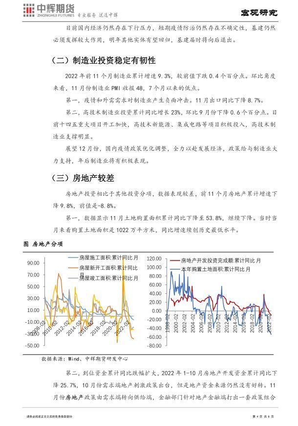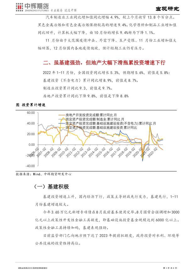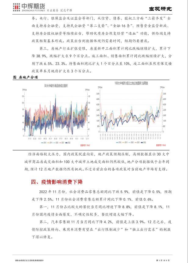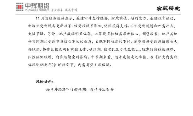 总之,11 月份国内疫情冲击、消费疲弱,经济数据不及预期,工业增加值受冲击,大幅下降。地产数据明显偏弱,政策没有拉松需求者信心。消费数据大幅下降,失业率上升。不过,基建仍在发挥托底作用,制造业仍然受到政策支撑。 整体数据表明目前稳主体、稳预期、稳增长压力依然较大。