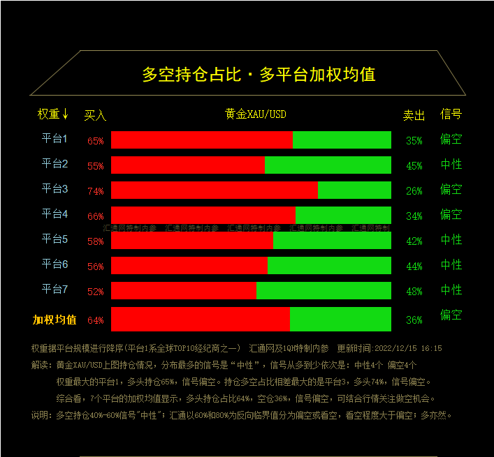 汇通财经APP讯——所谓“兼听则明 偏信则暗”,看交易品种的多空数据,或许也适用这个道理:因此本文汇通网及1QH特制,为投资者提供7-10个交易平台的多空数据进行参考,并按照平台规模的权重计算加权均值,仅供参考。图解黄金及外汇:多达10个平台的多空持仓及加权均值一览(2022/12/15周四)。