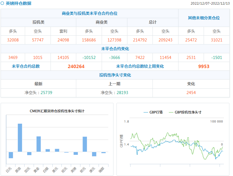 截至2022年12月13日的一周内,投机者持有的英镑净空头头寸减少25739手合约,瑞士法郎净空头头寸减少11811手合约,欧元净多头头寸为124715手合约,日元净空头头寸减少53188手合约。