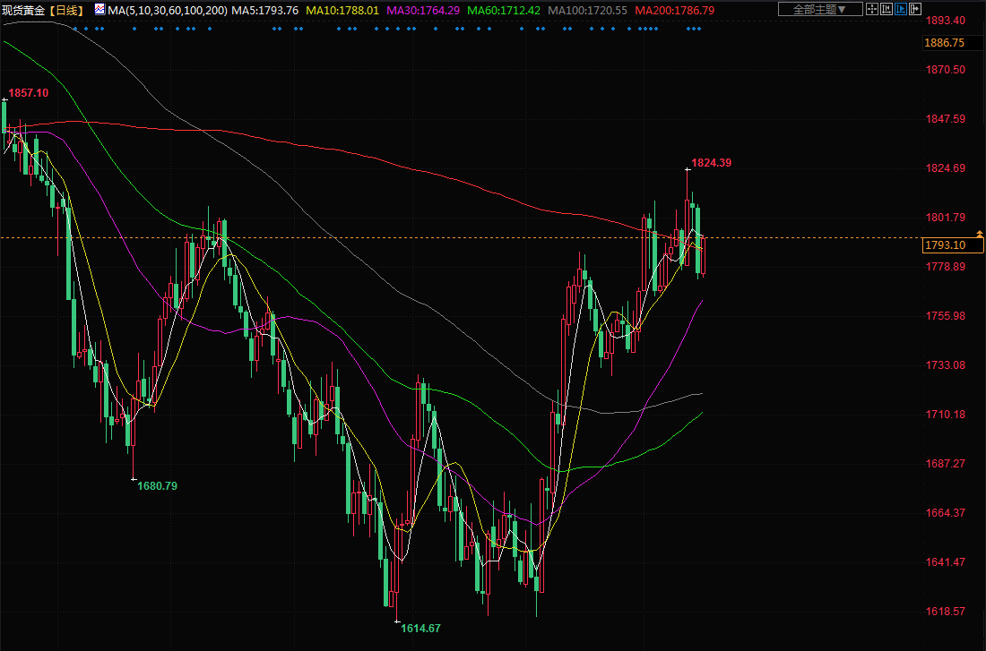 黄金周五反弹,但本周创11月中以来最大周跌幅,之前美联储表示需要进一步加息来抑制通胀。现货金上涨0.8%,至每盎司1791.59美元,但本周已下跌约0.3%。OANDA的高级分析师Edward Moya说,“很多交易员都在关注美联储和欧洲央行,它们暗示会进一步收紧政策,我们看到全球债券收益率大幅上升,这就是黄金本周下跌的原因。”