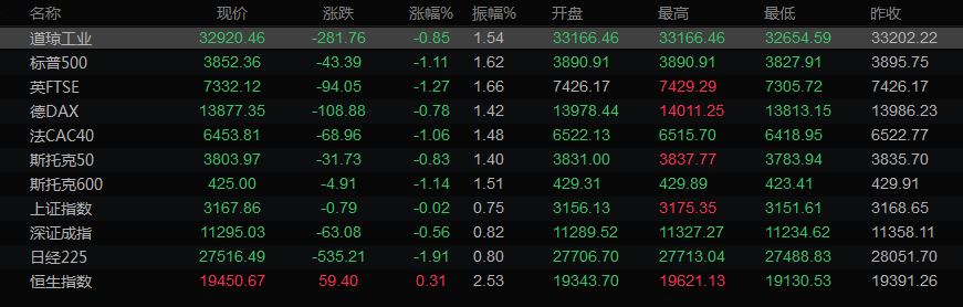 美股收盘情况: 道琼斯工业指数下跌0.85%,至32920.46点;标普500指数下跌1.11%,至3852.36点;纳斯达克指数下跌0.97%,至10705.41。