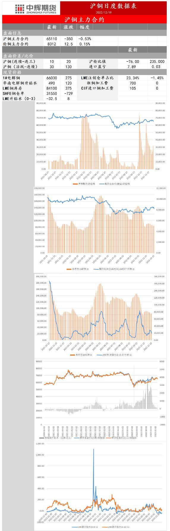 供应端:虽然南美矿端罢工和干扰不断,但是全球铜精矿整体供应宽松,加工费高位震荡,短期受铜精矿紧张影响,进口铜精矿指数(周)报87.67美元/吨,连续三周下滑。中国电解铜产量叠加净进口量为119.6万吨,环比减少4.9%,减量6.2万吨。截至12月19日周一,SMM全国主流地区铜库存环比上周五减少1.24万吨至8.19万吨,总库存较去年同期的8.67万吨低0.48万吨,为11月4日以来再度低于去年同期的平水,并创下近4年来历史同期最低值。进口铜窗口继续关闭,国内铜库存小幅去化,低库存对铜价下方仍有支撑。需求端:在消费端2022年12月预计实际消费量118.1万吨,环比减6.12%,减量7.7万吨。受疫情全面爆发和春节临近影响,中下游加工企业开工不足,需求偏弱,并有提前放假意向,传统的冬储备库动力不足。居民出行锐减,线下消费低迷。今日1#电解铜现货对当月2301合约报于升水440元/吨~升水540元/吨,均价升水490元/吨,较上周五上涨120元/吨。平水铜成交价格65820~66190元/吨,升水铜成交价格65900~66240元/吨。