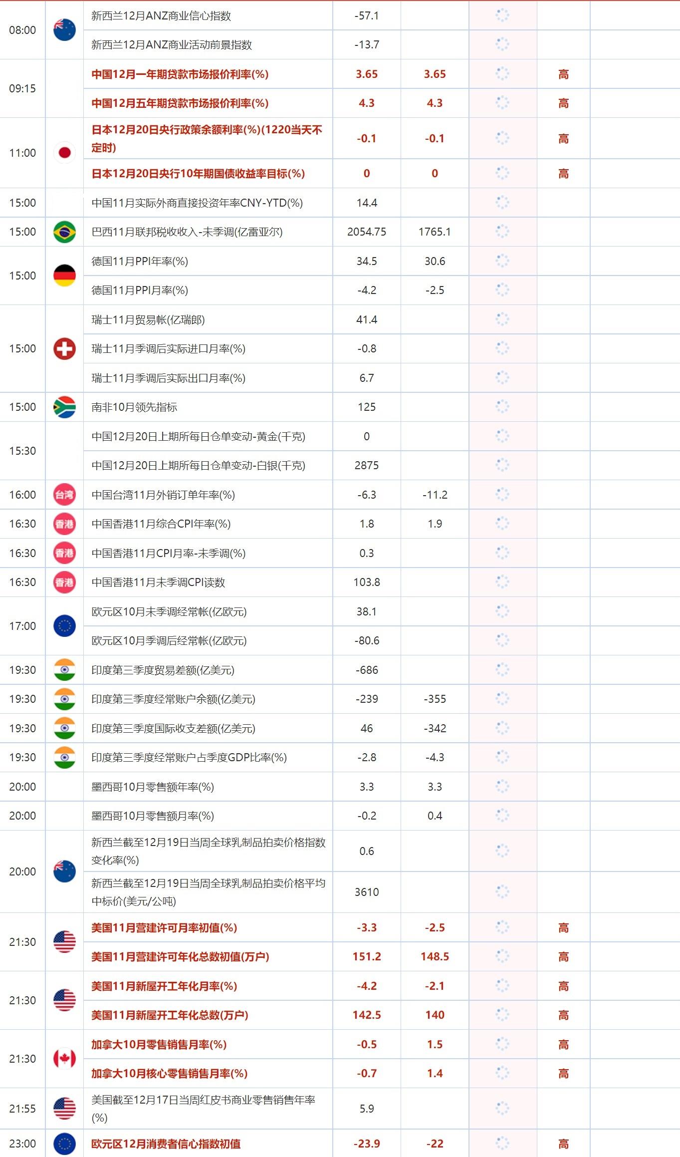 汇通财经APP讯——12月20日(周二),投资者需关注的重点数据:美国11月新屋开工年化月率,美国11月新屋开工年化总数,美国11月营建许可月率初值,美国11月营建许可年化总数初值,加拿大10月零售销售月率, 加拿大10月核心零售销售月率,以及欧元区12月消费者信心指数初值。需关注的大事件:澳洲联储公布货币政策会议纪要,日本央行公布利率决议,日本央行行长黑田东彦召开货币政策新闻发布会,韩国央行行长李昌镛就通胀目标政策发表半年度讲话。
