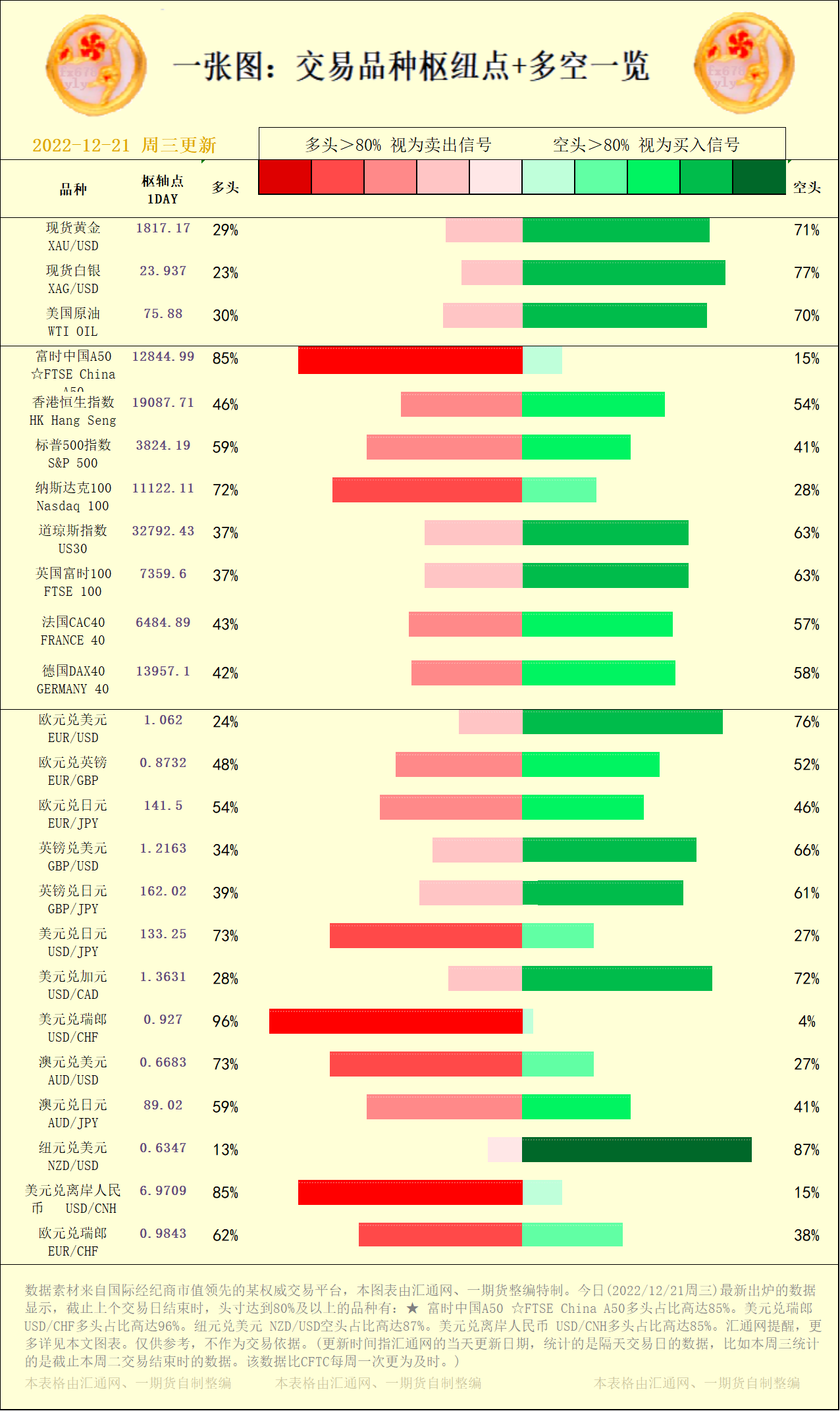 汇通财经APP讯——一张图:交易品种枢纽点+多空占比一览。今日(2022/12/21周三)最新出炉的数据显示,截止上个交易日结束时,头寸达到80%及以上的品种有:★ 富时中国A50 ☆FTSE China A50多头占比高达85%。美元兑瑞郎 USD/CHF多头占比高达96%。纽元兑美元 NZD/USD空头占比高达87%。美元兑离岸人民币 USD/CNH多头占比高达85%。汇通网提醒,更多详见本文图表。仅供参考,不作为交易依据。