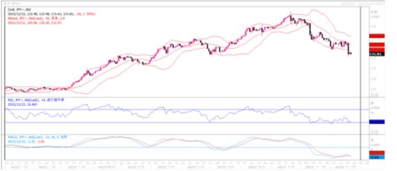 周三(12月21日)的外汇市场上,美元兑日元继周二走出一波大跌后,在空头回补交易带动下有所回升,当日升幅0.56%,盘中最高回到132.52,收盘于132.43。日本央行周二意外的改变货币政策举动,提高了市场对于日本央行也行将加入加息大军的高兴奋预期,为此部分投资者开始押注日元更大价值回归之旅,甚至认为日元将会是明年最强的货币之一。但是我们也还是要提高警惕,若日本央行在加息上还是迟迟未有实际行动的话,且美日利差依旧维持在较高的水平上,日元进一步上涨空间将受到抑制。日线图上,美元兑日元进入大跌后的空头回补调整中,各类技术指标朝下行。不出意外的话,经小幅回补调整完毕后,大概率美日将会继续向下测试130.00关口的支撑,若跌破将有望向公允值125发起冲击。