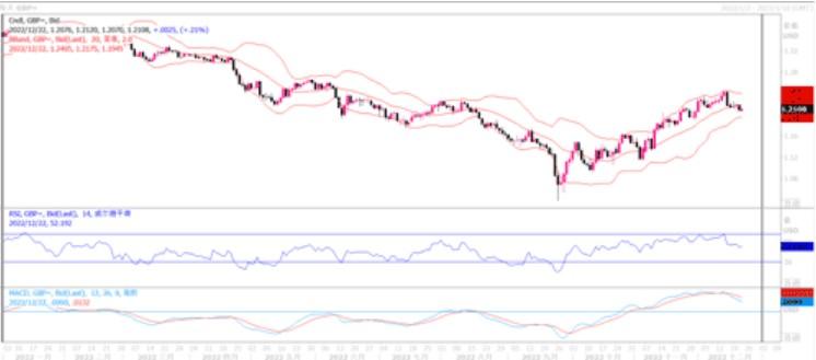 周三(12月21日),英镑兑美元下跌1.02%,报收于1.2085。在走了近三个月的升势后(升幅8.85%),英镑兑美元去到这轮升势的高点1.2447遇阻开始出现了回落苗头。英镑兑美元9月份以来的上升,很大程度上反映了其“高贝塔”地位,即恰逢全球股市上涨,投资者押注美联储正接近加息周期的临界点。而如今由于美联储和欧央行继续在加息方面保持高调,颇令英央行尴尬,在交叉盘中英镑遭到一定的抛售。因此近阶段,英镑兑美元的走势恐怕面临较为关键的抉择。日线图上英镑兑美元开始跌落各短期均线下方,各类技术指标均超下行,显示英镑下行压力加重。当前下方的重要支撑在1.20大关,若跌穿,将导致镑美跌向1.1900和10月份的高位1.1645。相反若能顽强守住1.20水平之上,则后市仍有望向高处攀爬。