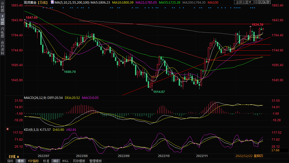 汇通财经APP讯——周四(12月22日)亚洲时段,现货黄金震荡微涨,目前交投于1818.88美元/盎司附近,美国11月成屋销售数据表现较差,对美元产生拖累,目前已经下跌0.24%,回吐了周四大部分涨幅;美债收益率周三涨势放缓,周四也小幅走弱,给金价提供支撑;乌克兰总统去美国与美国总统拜登会晤,增加地缘局势担忧,也增加黄金的吸引力。黄金技术面看涨信号有所增加,有望小幅向上突破。