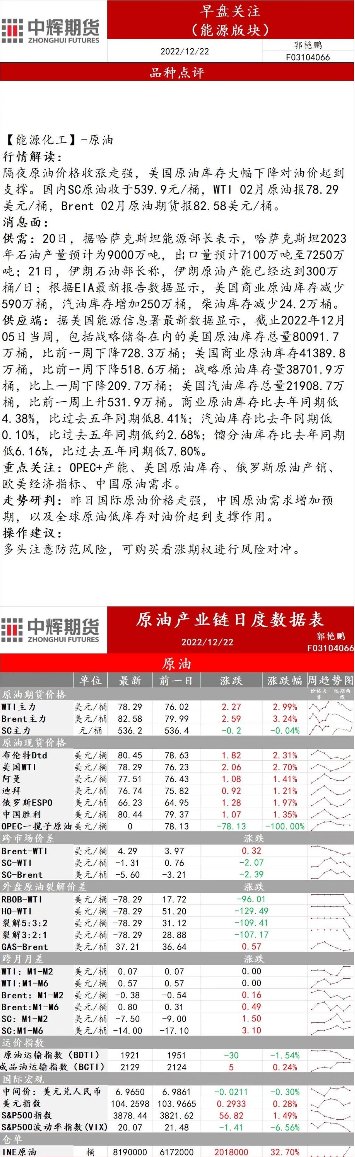 汇通财经APP讯——12月22日,中辉期货发布能源早盘关注,建议多头注意防范风险,可购买看涨期权进行风险对冲。