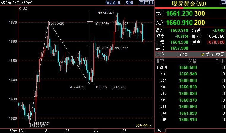 北京时间15:04,现货黄金下跌0.21%至1661.14美元/盎司;COMEX期金主力合约下跌0.24%至1665.2美元/盎司;美元指数上浮0.15%至109.846。