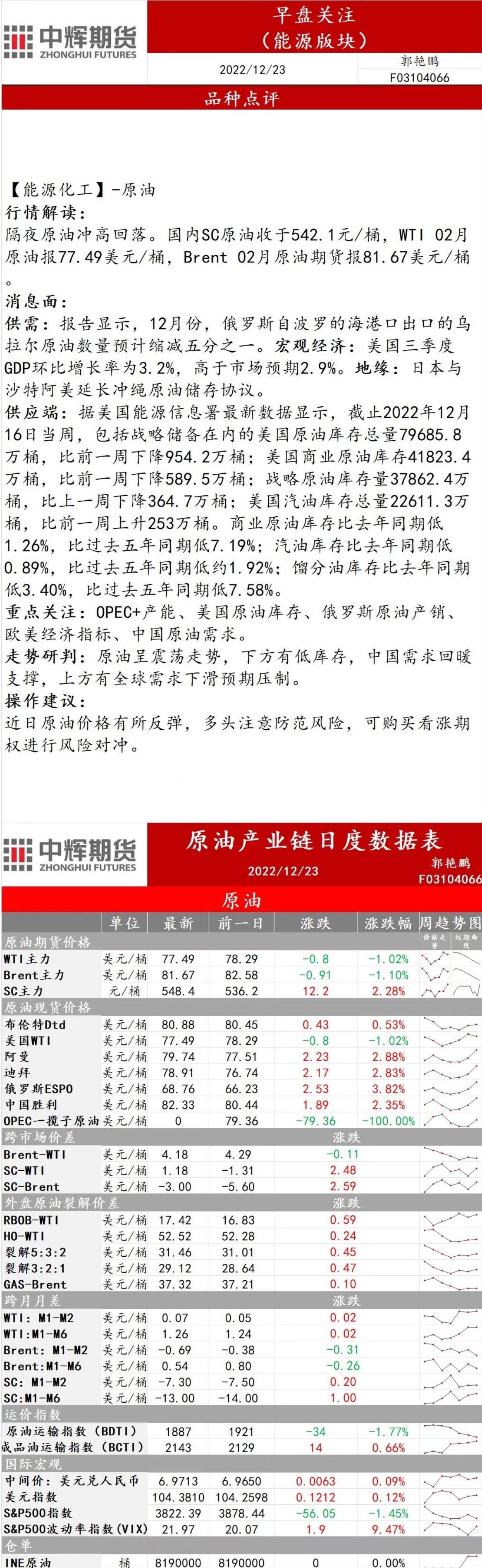 汇通财经APP讯——12月23日,中辉期货发布能源早盘关注,称近日原油价格有所反弹,多头注意防范风险,可购买看涨期权进行风险对冲。