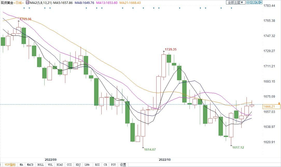 北京时间10月27日13:14,现货黄金报1666.44美元/盎司