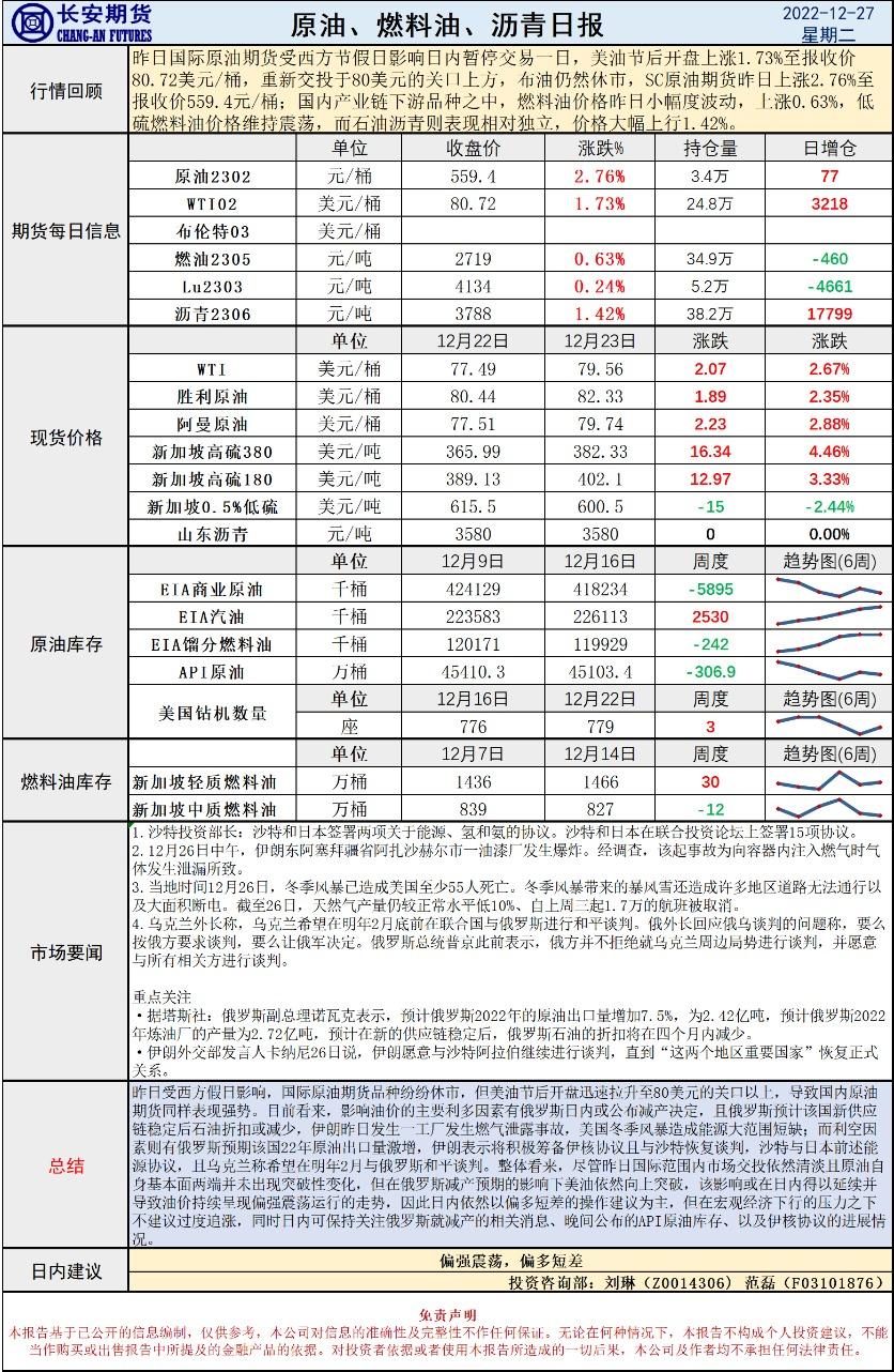 汇通财经APP讯——12月27日,长安期货发布原油早评,认为原油将偏强震荡,建议偏多短差。