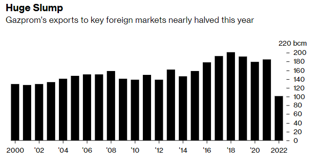 财联社12月29日讯 根据俄罗斯天然气工业股份公司周三公布的最新数据,俄罗斯今年对非独联体国家的管道天然气出口量骤降几乎“腰斩”,创下了至少本世纪以来的最低水平,因在俄乌冲突爆发后运往欧洲的天然气流量锐减,且最为关键的北溪天然气管道遭遇了爆炸破坏。