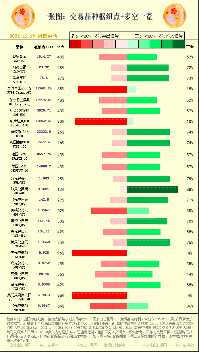 汇通财经APP讯——一张图:交易品种枢纽点+多空占比一览。今日(2022/12/29周四)最新出炉的数据显示,截止上个交易日结束时,头寸达到80%及以上的品种有:★ 富时中国A50 ☆FTSE China A50多头占比高达85%。纳斯达克100 Nasdaq 100多头占比高达90%。欧元兑英镑 EUR/GBP空头占比高达88%。美元兑瑞郎 USD/CHF多头占比高达96%。美元兑离岸人民币 USD/CNH多头占比高达96%。汇通网提醒,更多详见本文图表。仅供参考,不作为交易依据。