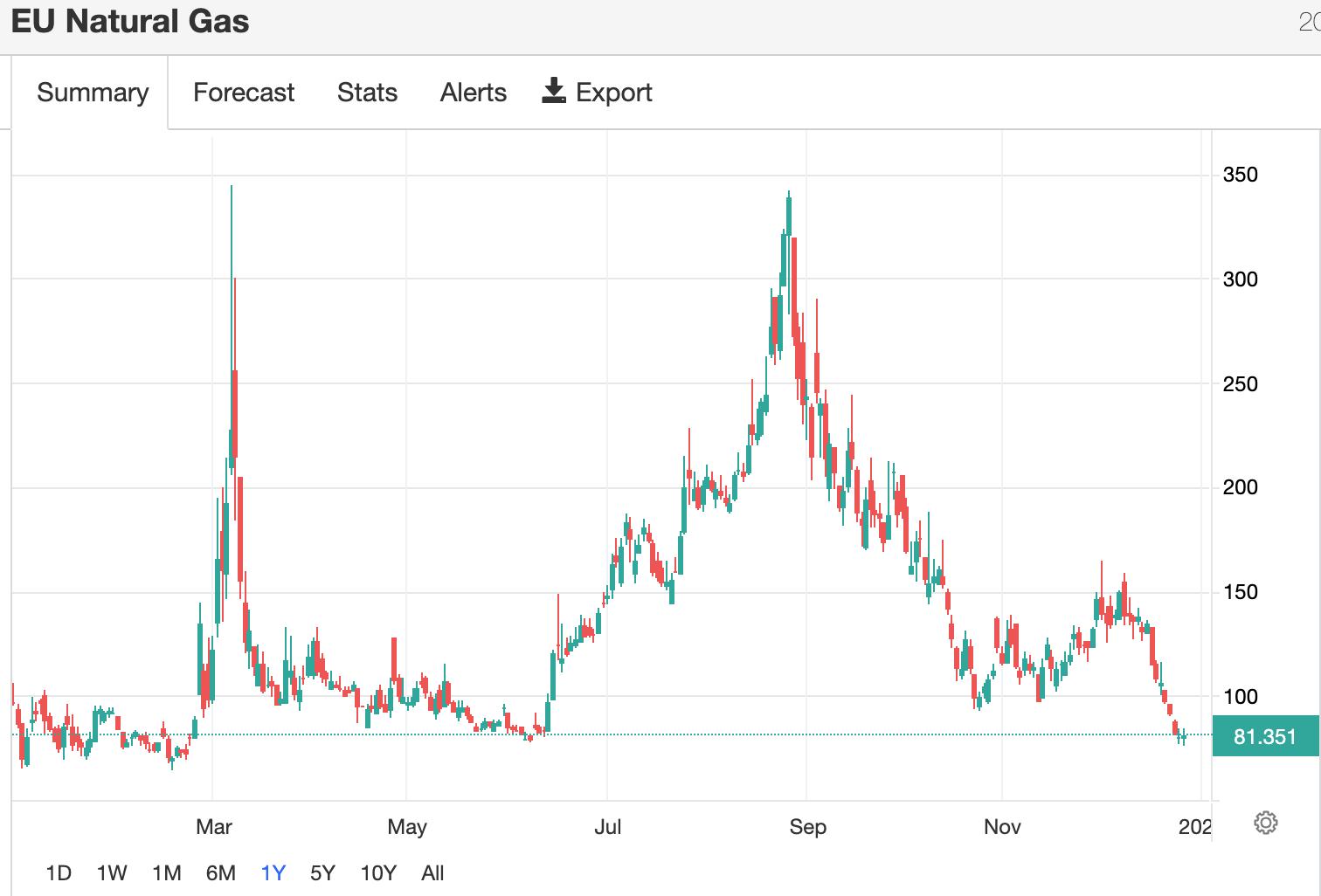 (欧洲天然气价格今年走势,来源:TradingEconomics)