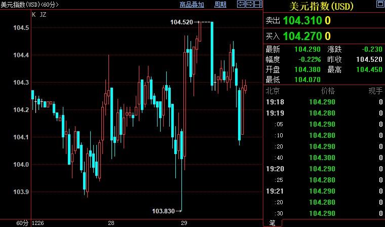 北京时间19:20,现货黄金上涨0.10%至1805.96美元/盎司;COMEX期金主力合约下跌0.17%至1812.7美元/盎司;美元指数下得0.22%至104.289。