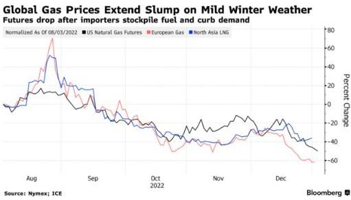 分析师Abhishek Rohatgi表示:“市场此前所担心的能源供应紧张问题已有所缓解,欧洲地区天然气库存已经重建,而整个北亚地区的温和天气意味着市场对液化天然气货物的竞争需求将会进一步减少。”