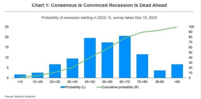 下图显示了2023年美国经济陷入衰退的可能性,其中蓝色柱代表衰退可能性,绿色线代表累积起来的可能性,可以看到随着时间推移,陷入衰退的概率整体在不断上升