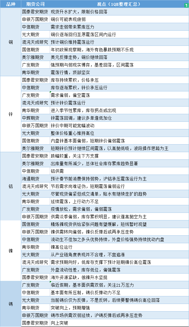 期货公司观点汇总一张图:1月4日有色系(铜、锌、铝、镍、锡等) Posted on Jan 04, 2023 Jan 04, 2023 汇通财经APP讯——期货公司观点汇总一张图:1月4日有色系(铜、锌、铝、镍、锡等) 标题: 期货公司观点汇总一张图:1月4日有色系(铜、锌、铝、镍、锡等) 地址: jnwq0531.cn/article/1377.html