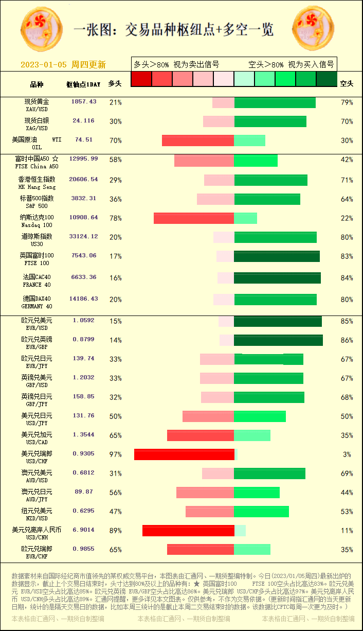 汇通财经APP讯——一张图:交易品种枢纽点+多空占比一览。今日(2023/01/05周四)最新出炉的数据显示,截止上个交易日结束时,头寸达到80%及以上的品种有:★ 英国富时100 FTSE 100空头占比高达83%。欧元兑美元 EUR/USD空头占比高达85%。欧元兑英镑 EUR/GBP空头占比高达86%。美元兑瑞郎 USD/CHF多头占比高达97%。美元兑离岸人民币 USD/CNH多头占比高达89%。汇通网提醒,更多详见本文图表。仅供参考,不作为交易依据。