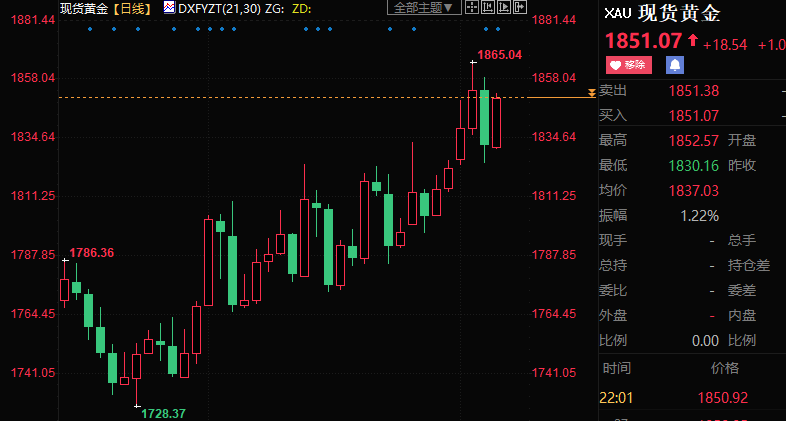 截止发稿,现货黄金周线上涨1.50%至1850.40美元/盎司;美元指数周线上涨1.41%至104.955。