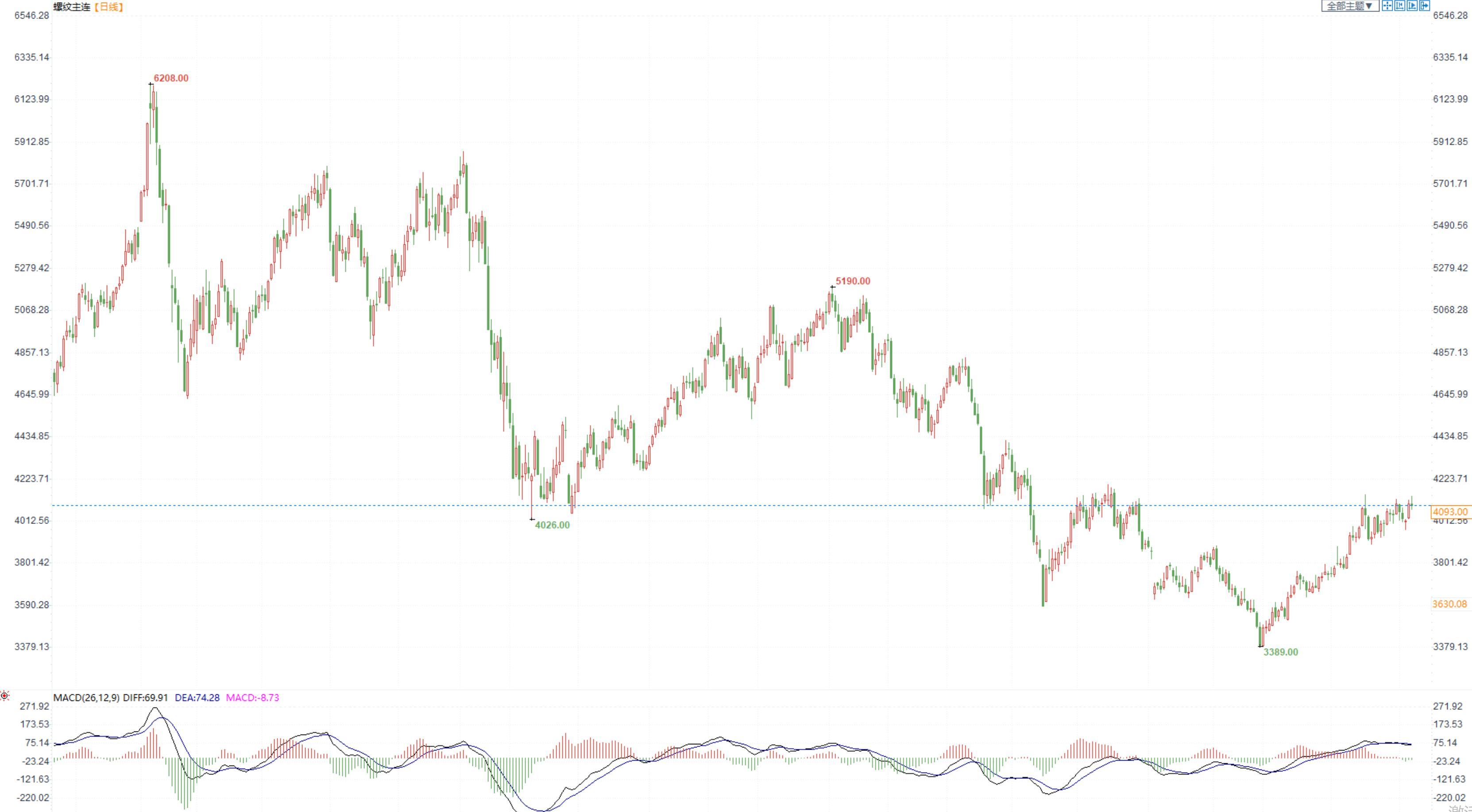 价格:螺纹钢2305合约自上周五夜盘冲高回落后,今日持续窄幅震荡运行,收盘价4093元/吨,小幅收涨0.57%。上海中天现货价4120元/吨,较上周价格暂稳。