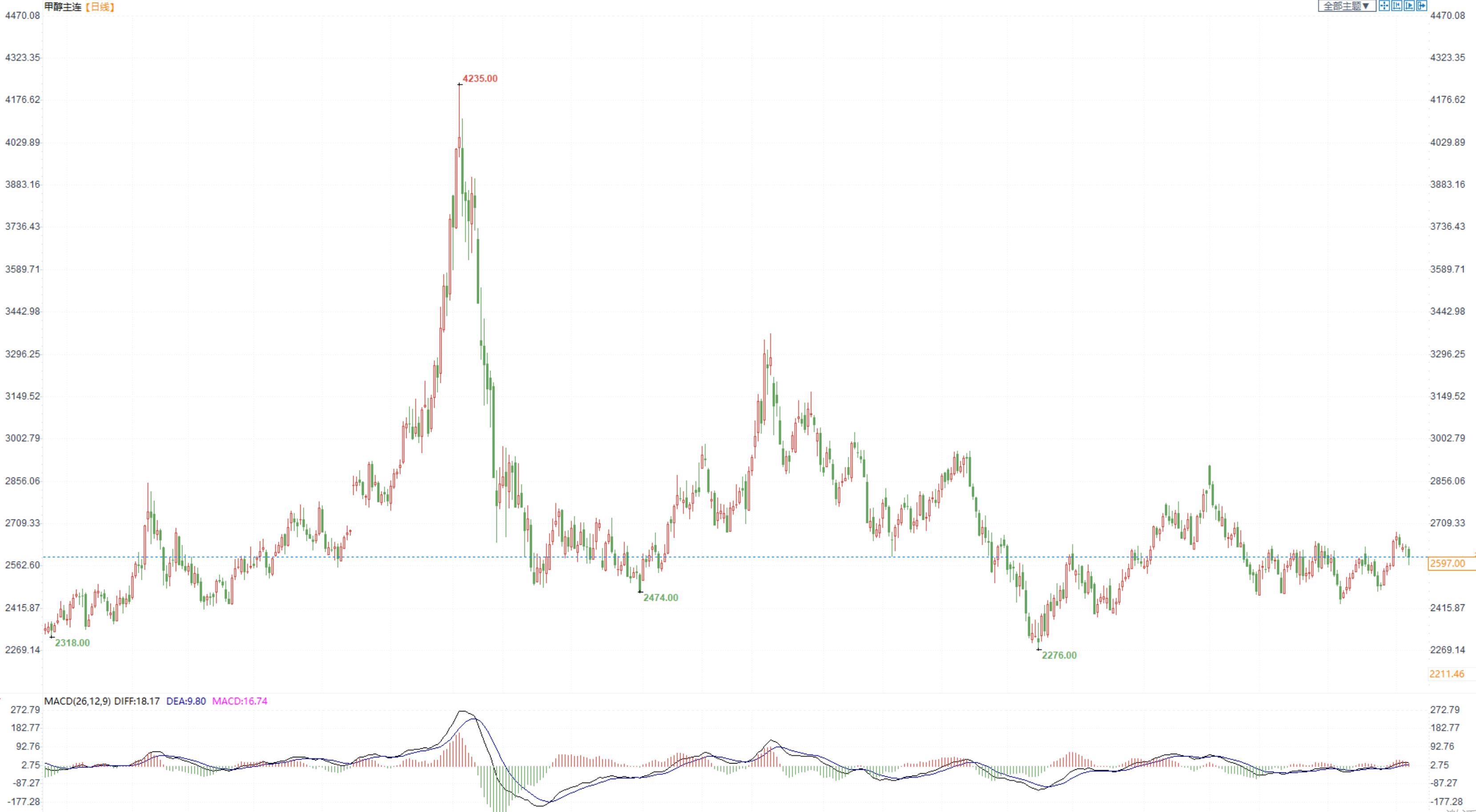 期货市场,甲醇2305合约小幅收跌,收盘价2597。现货端,港口库存低,目前现货依旧强势于期货。