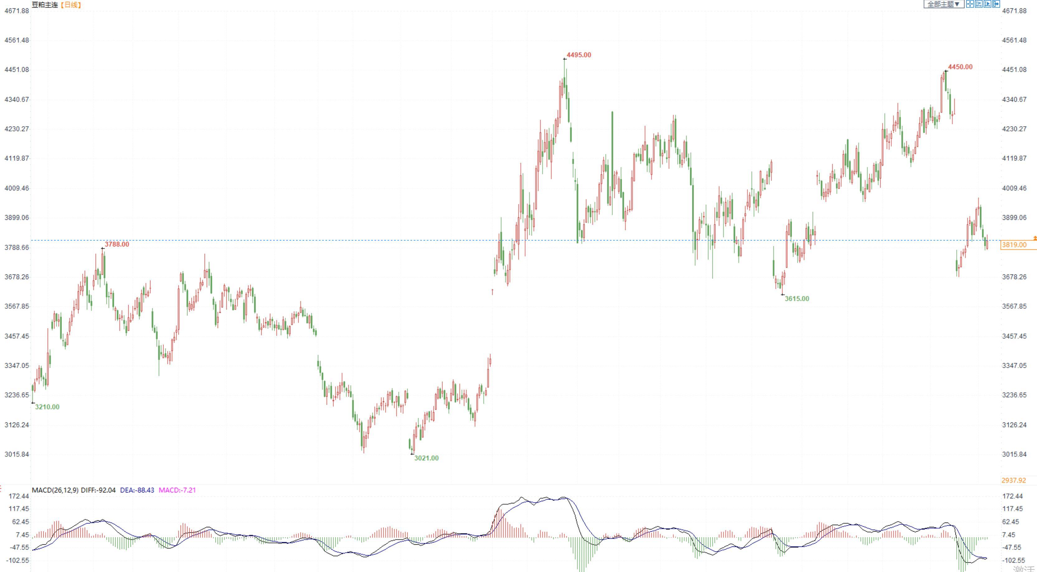 豆粕2305合约日内涨0.47%,收盘价3819元/吨,现货张家港43%蛋白豆粕4540元/吨