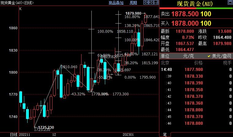 汇通财经APP讯——周一(1月9日),国际金价扩大涨势,创5月9日以来的八个月新高至1879.84美元/盎司,美元走软使得以美元计价的黄金对海外买家来说更便宜,投资者押注美联储2023年加息轨迹不那么激进。金价短线上看1885美元。