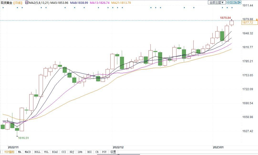 北京时间1月9日14:42,现货黄金被1877.73美元/盎司