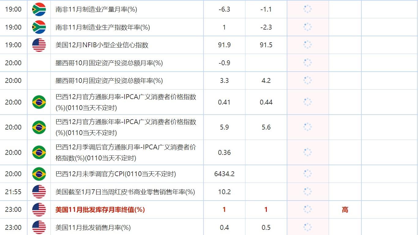 20:00 巴西12月季调后官方通胀月率-IPCA广义消费者价格指数(%)(0110当天不定时) , 前值 0.36 , 预期值 -- , 公布值:待发布